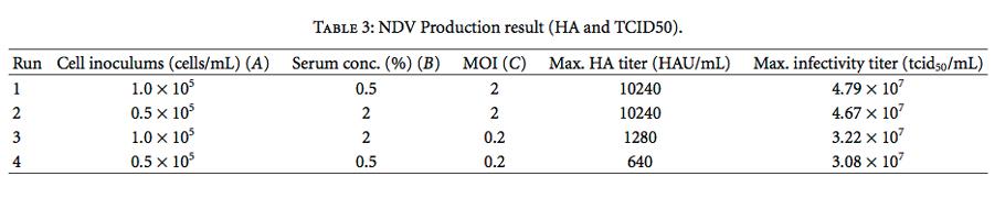 are presented in Table 4. As shown in the table, MOI was the most significant factor in yielding NDV as it has the lowest P value and less than .05. The analysis also suggests that yield of NDV can be increased when cell inoculum and MOI are increased. For predicting the optimal values of NDV produced, a linear model was fitted to the experimental results for the NDV yield by the Design Expert software. The model developed is as follows: