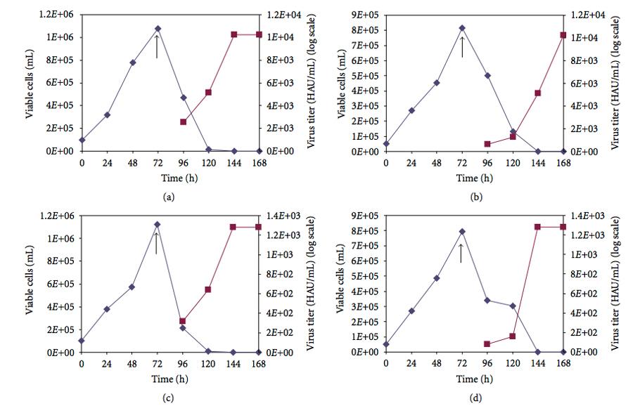 Figure 4: Growth of Vero cells on Cytodex 1 microcarrier and production of NDV: (a) cell inoculums: 1.0 × 105 cells/mL, serum concentration: 0.5%, MOI: 2.0; (b) cell inoculums: 0.5 × 105 cells/mL, serum concentration: 2.0%, MOI: 2.0; (c) cell inoculums: 1.0 × 105 cells/mL, serum concentration: 2.0%, MOI: 0.2; (d) cell inoculums: 0.5×105 cells/mL, serum concentration: 0.5%, MOI: 0.2. (↑) indicates cell infection. |